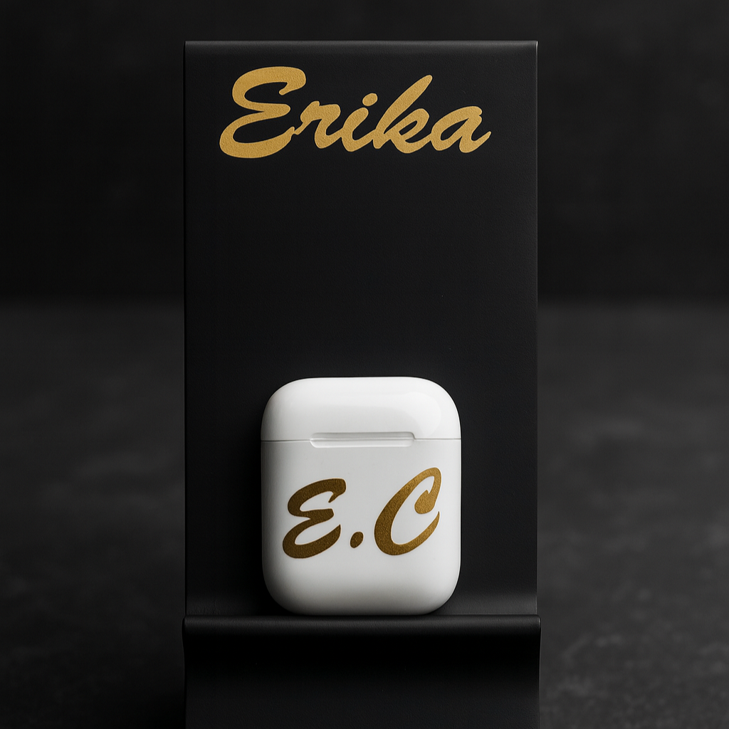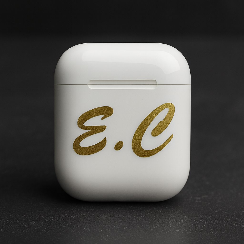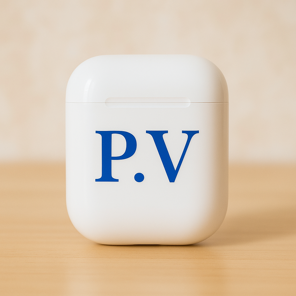 Gör dina AirPods unika med en personlig dekal i självhäftande vinyl. Välj initialer i valfri färg och typsnitt. Enkel att sätta på, slitstark och lämnar inga märken. Perfekt för AirPods-fodral och andra släta ytor.